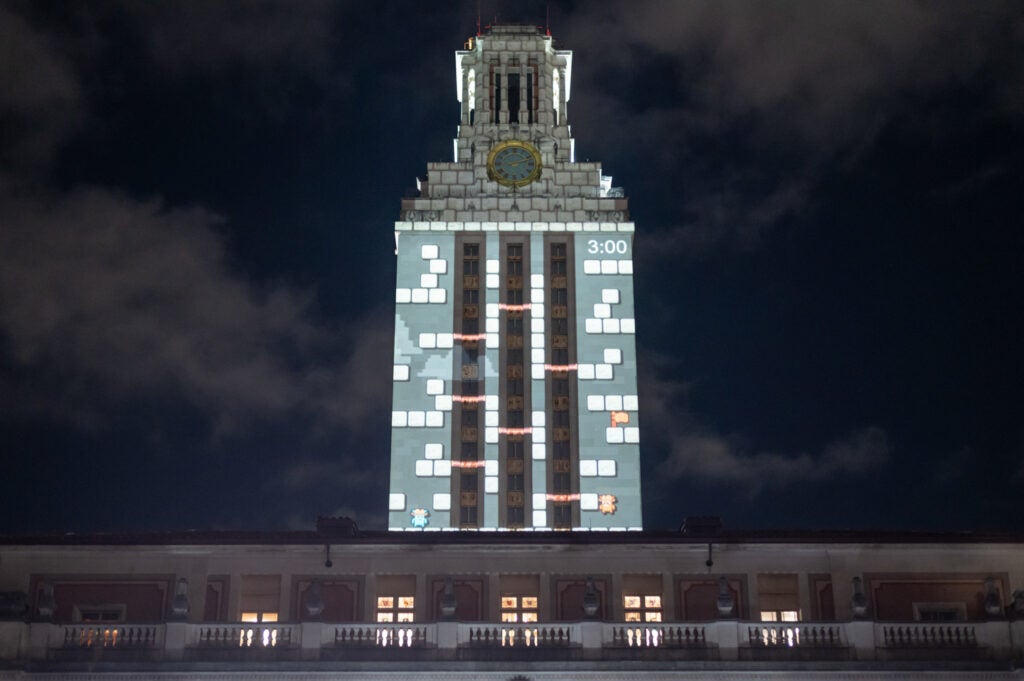 The Tower serves as a canvas for video projections of Rubik’s cube-like rotating blocks showing the faces of notable UT alumni including Walter Cronkite and Michael Dell. The unique display was created for UT’s institutional commercial broadcast during games.