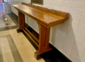There are many other pieces of original furniture scattered throughout the building and within its 27-floor Tower, and not all of them require searching. Two such pieces are visible the moment one enters the main corridor on the ground floor: two standing-height tables against the walls that hearken to an age when the admissions, registrar’s and bursar’s offices, long housed there, ran on pen and paper.