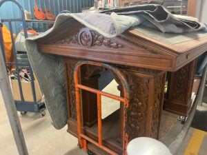 Although the English Collection desk shown above may have never made it out of the carpentry shop, other pieces in the English Collection certainly did. Last year at UT Surplus on the J.J. Pickle Research Campus, Barker was walking around with Mark Engelman, who runs that operation, when he lifted a blanket and said, “We have this thing. We’re not really sure what we’re doing with it.” The intensely carved wood-and-glass display case looked familiar to Barker, so she snapped a picture, and when she got back to her desk, she started digging.