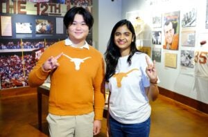 In 2000, UT’s Division of Student Affairs established a scholarship that honors the Longhorns who stood united with Aggies after the bonfire collapse. This year’s recipients are Aarushi Garg, a Plan II Honors and international studies and global relations junior, who is being honored for her participation in international and global affairs on campus. She is an undergraduate research fellow with the Clements Center for National Security and a fellow with the Texas Cybersecurity Clinic through the Strauss Center. Isaac Wang, a Plan II Honors and psychology senior, is being recognized for his involvement with community health-care organizations. He was an apprentice, researcher and volunteer through several Dell Medical School clinical programs, mentored children at a local school, and volunteered at local hospitals in pediatric units.