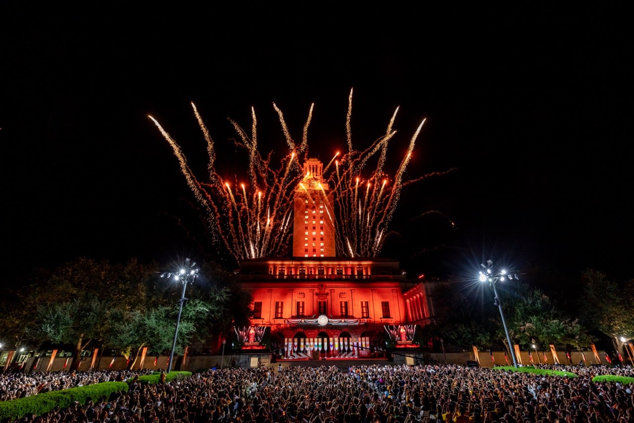 Likewise, each August before the first day of class, freshmen gather in front of the Tower for Gone to Texas, a Texas-sized tradition to celebrate the beginning of their journey as Longhorns. This year, the Tower lit up burnt orange with “29” on all sides for the incoming class, whose members won’t see “29” on the Tower again until their commencement ceremony in May 2029.